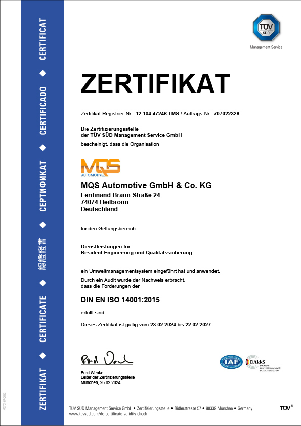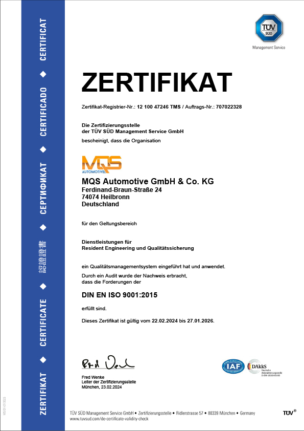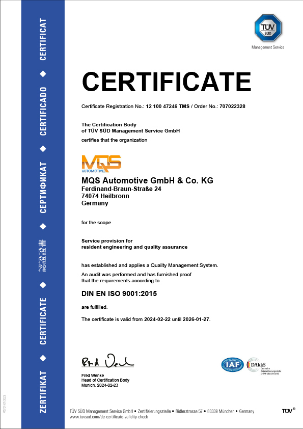 Cette certification atteste officiellement que MQS répond aux exigences strictes de la gestion de la qualité dans tous les domaines concernés. Pour vous, cela signifie la certitude d’avoir à vos côtés un partenaire dont les prestations sont continuellement contrôlées et optimisées. Vous pouvez donc être sûr que nous vous fournirons toujours la meilleure qualité et la fiabilité promise.